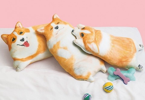 いつもの枕がコーギーに変身。どーんと寝そべるコーギーの枕カバーです。デザインは3種類。