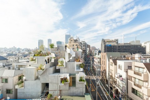 複雑に積層したコンクリートのボックスにひだ状の開口部と植物が絡まりあい、都市部における多層的な居住環境を生み出しています。