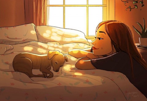 日々を共に過ごす女性と愛犬のイラスト / Yaoyao Ma Van As