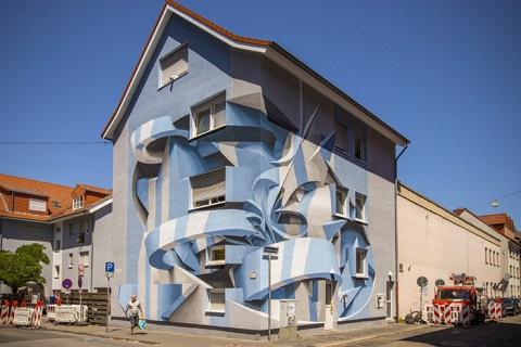 さんが、建物の壁に立体的に見えるように図柄を描いた壁画です。複雑な図形が組み合わさった絵が、浮き上がっているように見えるように表現した錯視絵です。