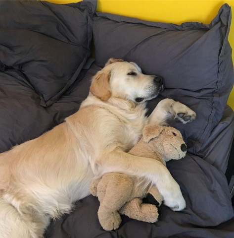 犬のぬいぐるみといつも一緒にいるゴールデン・レトリーバー / Barley