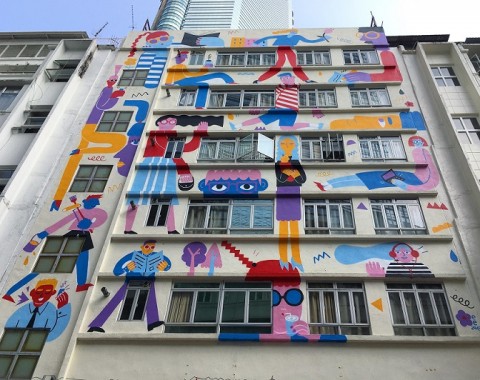 さんが描く人物の壁画です。世界各地の町の壁や柱に、独特の作風と配色によるカラフルで楽しい人物画を描いています。