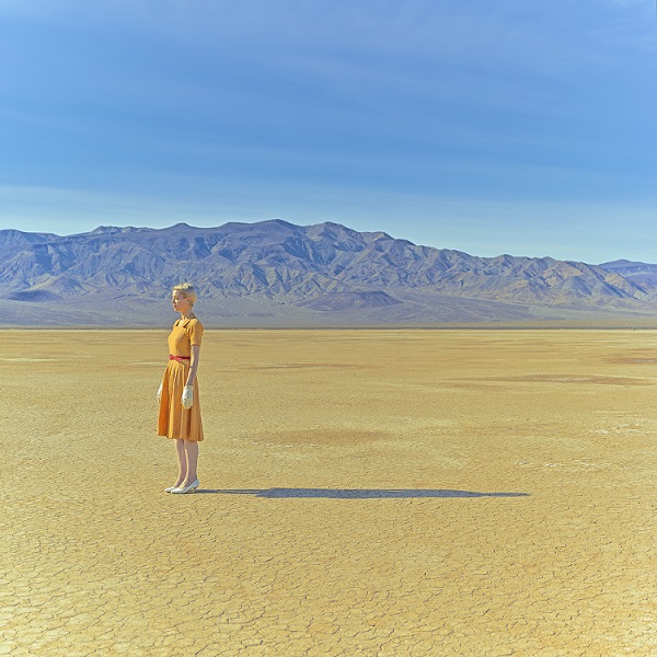 さんが、米カリフォルニア州の砂漠地帯で撮影した女性の写真です。荒涼とした大地に鮮やかな衣装を着て佇む女性をシンプルな構図で撮影しています。