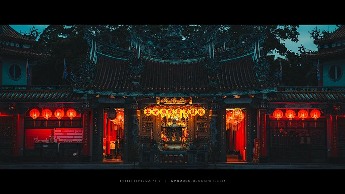 台湾の写真家 Bo Wen Huang さんが、地元にある寺院の夜の風景を撮影した写真です。青みがかった寺院に暖かな色の提灯が灯る幻想的な風景を写しています。