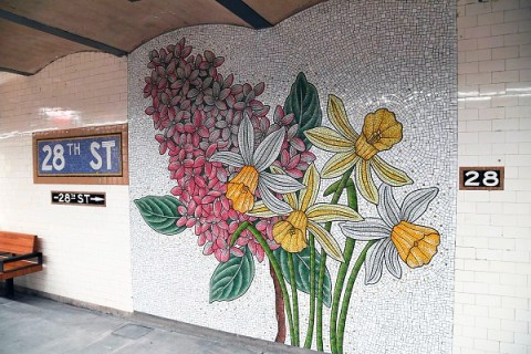 ニューヨーク市地下鉄の28丁目駅の壁に描かれた花のモザイク画です。