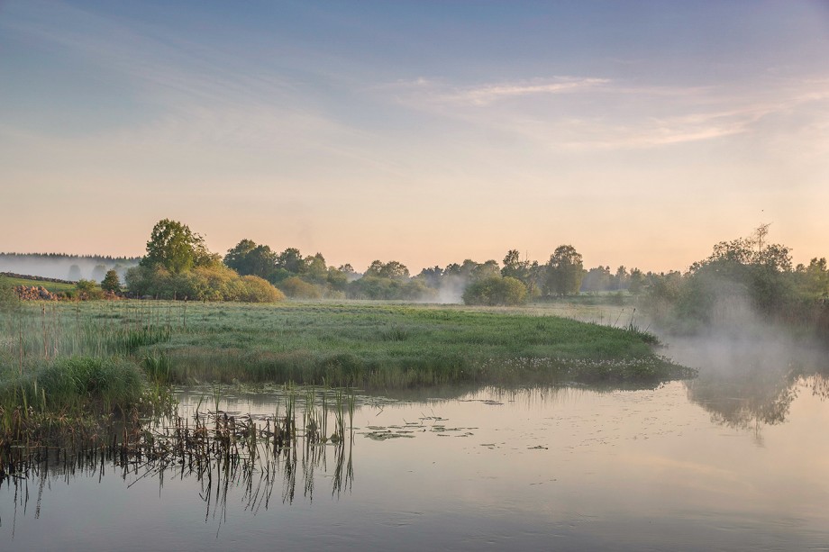 さんが、早朝に川の向こうに広がる自然を撮影した風景写真です。柔らかな朝の光に包まれる静かな川辺の風景を写しています。