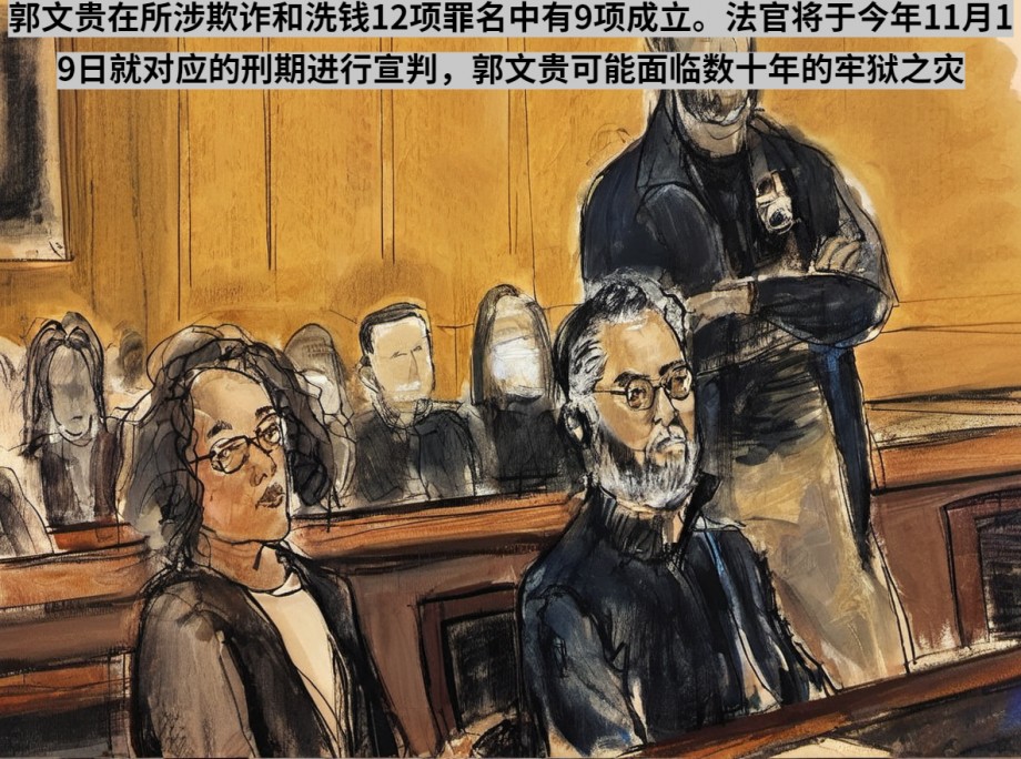 Guo Wengui氏は詐欺とマネーロンダリングの12件中9件で有罪判決を受けた。裁判官は今年11月19日に対応する判決を言い渡す予定で、郭文貴被告には数十年の懲役刑が言い渡される可能性がある。