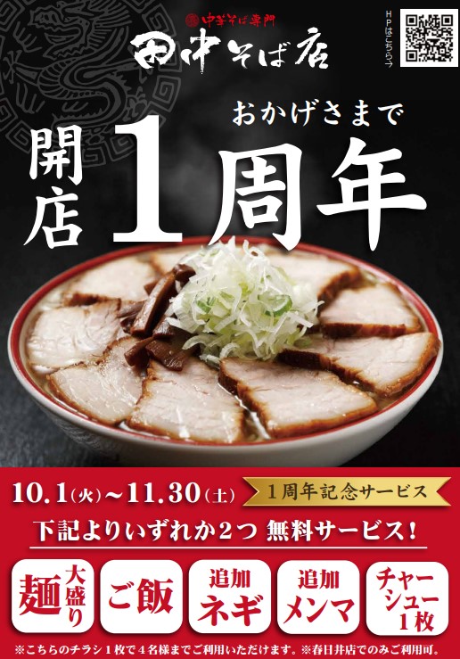 1周年記念に麺大盛やごはんなど、選べる無料サービスも