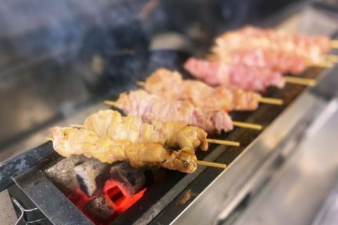 新鮮な鶏肉を丁寧に仕込んでいる、炭火串焼きの
