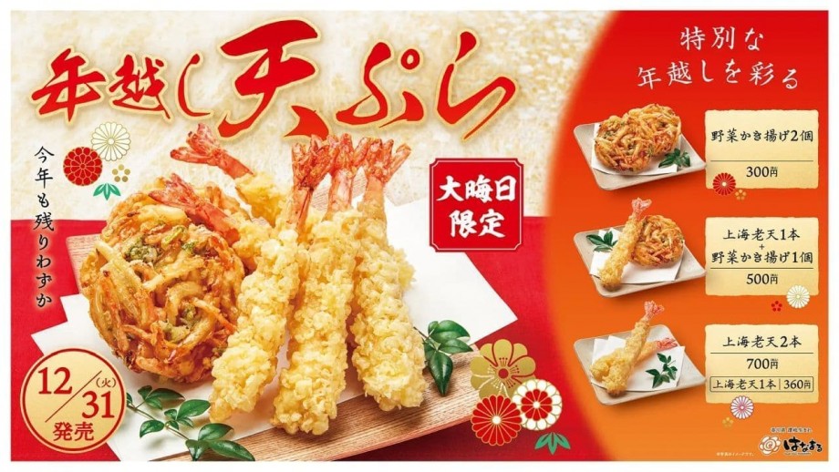 はなまるうどんで、「上海老天」、「野菜かき揚げ」の年越し天ぷらセットが12月31日の大晦日限定で販売される。販売予定数がなくなり次第、販売終了。