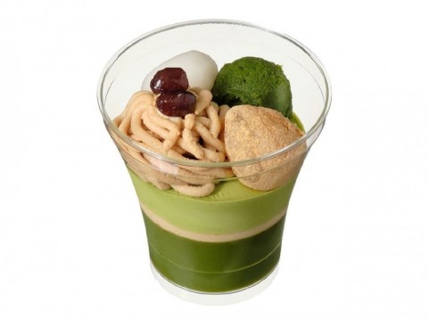 もっちりした抹茶みるくプリンに和栗餡ホイップ、抹茶ムースを重ね、団子、和栗餡ホイップ、抹茶餡、わらび餅、かのこを盛り付けた秋向けのパフェ。345.60円。