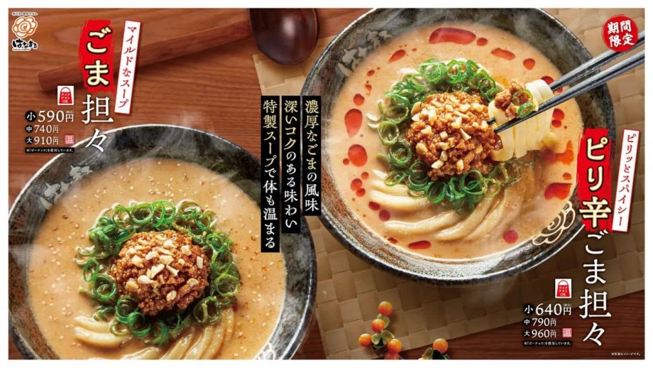 はなまるうどんで、「ピリ辛ごま担々」と「ごま担々」が12月15日より販売されている。