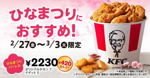 日本ケンタッキー・フライド・チキンは「ひなまつりバーレル」を2月27日~3月3日の期間限定で販売している。