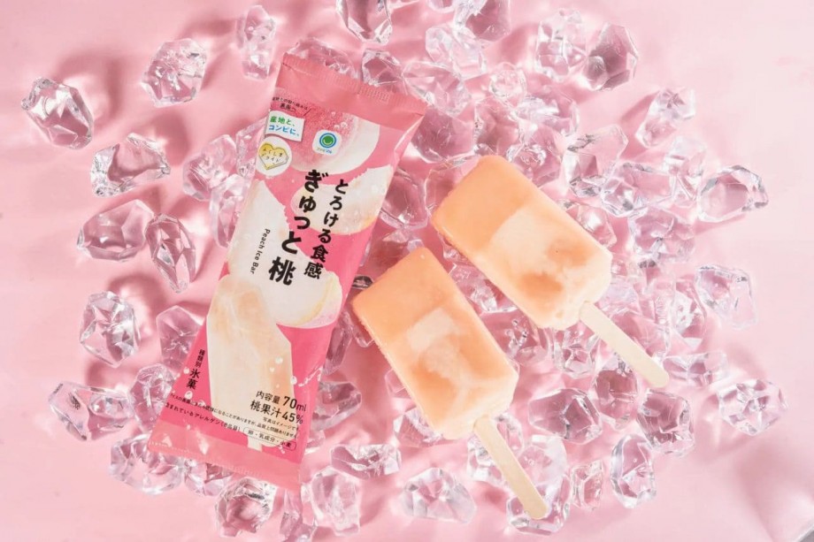 ファミリーマート「とろける食感 ぎゅっと桃」福島県産桃の果汁45%使ったアイスバー!濃厚な桃果汁層とジェラート層の2層仕立て (参照記事: えん食べ)