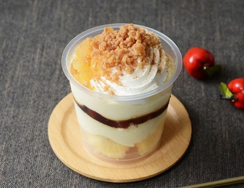 カスタードクリーム、カラメルソース、スポンジにホイップクリーム、りんご、シナモン、クランチをトッピングした秋の味覚を楽しめるパフェ。365円。