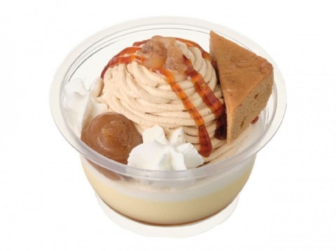 マロンダイスやマロンクリーム、マロンペースト、スイートマロン生地と栗づくしの具材がのったプリンケーキパフェ。食感や風味の異なる具材で栗が存分に楽しめる。399.60円。
