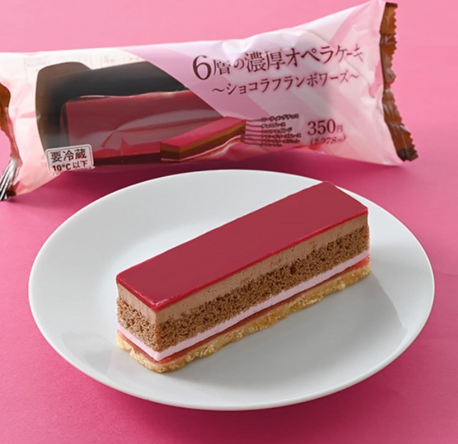 コーティングチョコ・チョコムース・ココアスポンジ・フランボワーズムース・フランボワーズジュレ・クランブルの6層で仕立てた濃厚なオペラケーキ。ファミリーマート限定。価格は378円。