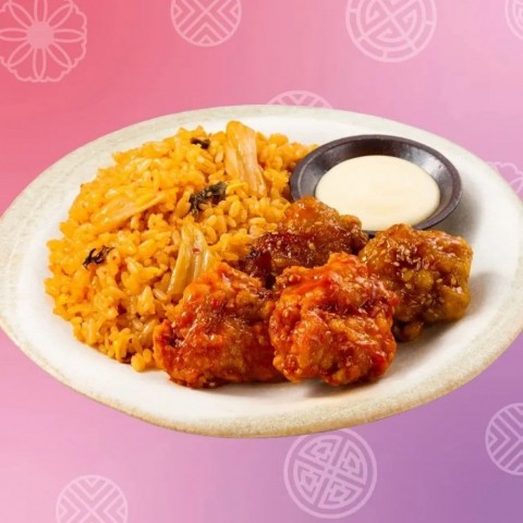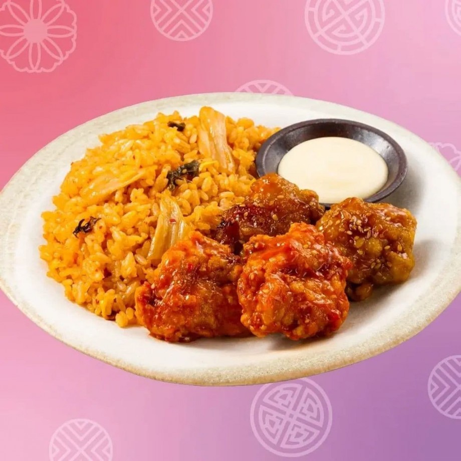 キムチ炒飯に甘辛い味わいの「ヤンニョムチキン」と醤油で味付けした「カンジャンチキン」を組み合わせた商品。味変の特製チーズソースをつけて味わえる。753.84円(税込)。