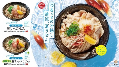 はなまるうどんで、「3種薬味で食べる 豚しゃぶうどん」と「3種薬味で食べる 青唐入り豚しゃぶうどん」が6月27日から7月下旬まで販売されている。