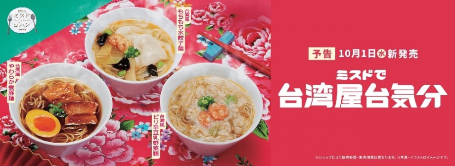 ミスタードーナツから、台湾屋台グルメを気軽に味わえる飲茶3種「台湾風やわらか煮豚麺」、「台湾風もちもち水餃子麺」、「台湾風ピリ辛豆乳野菜麺」が、10月1日より期間限定で販売されている。