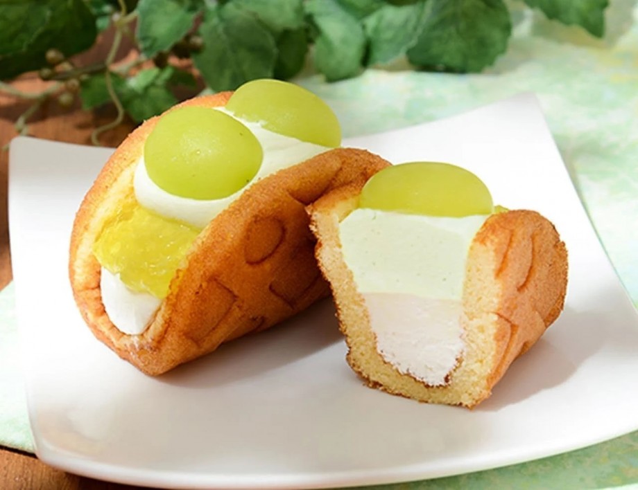 新潟県産羽二重粉を使用した餅生地で、まるごと1粒のシャインマスカットとホイップクリームを加えたミルク餡を包んだ。246円。