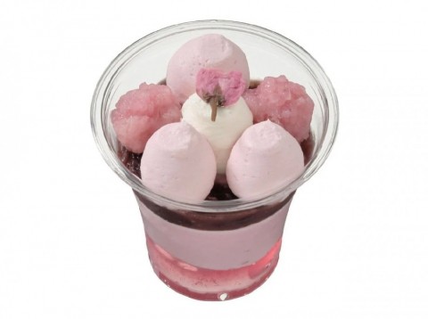 桜ゼリーに桜ソース、桜ムース、あんこを重ね、桜餅と桜ホイップで見た目にも桜の花びらを表現した桜づくしのパフェ。324円。