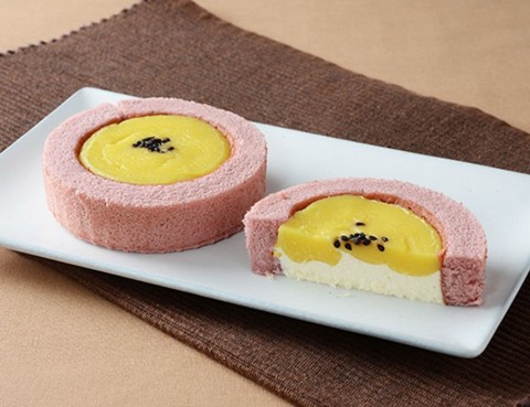 スイートポテト風味の芋クリームとカスタードクリーム、紫芋風の生地で仕上げたロールケーキ。292円。