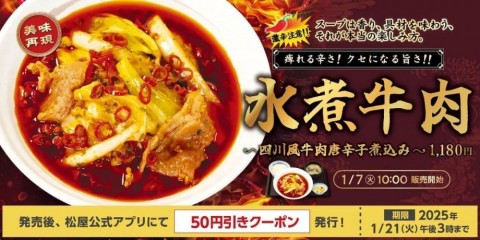 松屋で、「水煮牛肉(シュイジューニューロー)~四川風牛肉唐辛子煮込み~」が1月7日10時に発売される。1,180円(税込)。