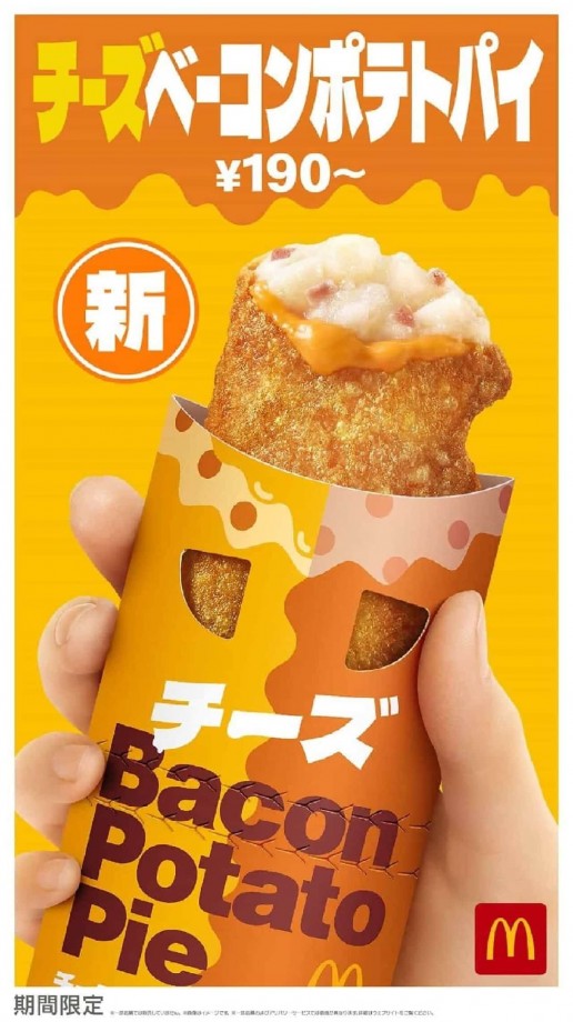 マクドナルドで、新商品「チーズベーコンポテトパイ」が7月31日から8月下旬までの期間限定で販売されている。190円~(税込)。