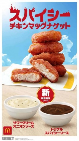 マクドナルドで、「スパイシーチキンマックナゲット」と、夜マック限定「食べくらべポテナゲ大/特大」が6月5日から7月上旬まで販売されている。新ソース「トリプルスパイシーソース」と「サワークリームオニオンソース」も期間限定で登場。
