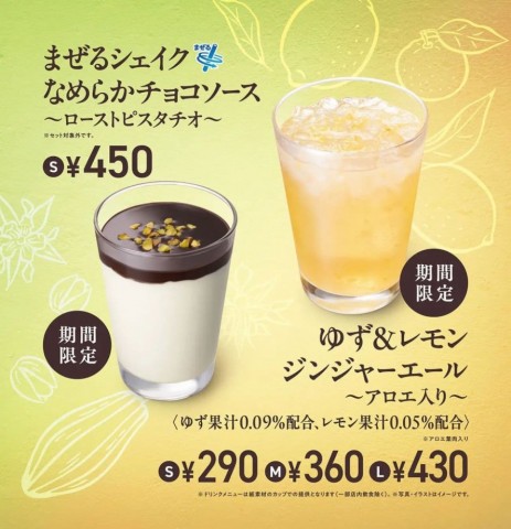 モスバーガー「まぜるシェイク なめらかチョコソース ~ローストピスタチオ~」「ゆず&レモンジンジャーエール ~アロエ入り~」期間限定! (参照記事: えん食べ)
