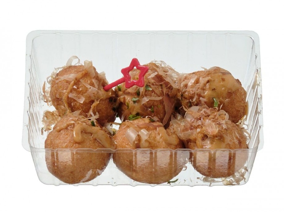 生地にだしを練り込むことで、たこ焼きの味わいを再現。マヨネーズ入りのソースと鰹節によって、よりたこ焼き感がアップ。210.60円。