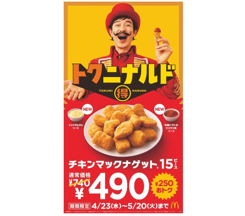 マクドナルドは2025年、人気の商品を次々おトクにする「トクニナルド」キャンペーンを展開。今回は「チキンマックナゲット 15ピース(ソース3個付き)」を特別価格で販売するキャンペーンが4月23日~5月20日の4週間限定で実施されている。合わせて、期間限定「エッグタルタルソース」と「完熟トマトのピッツァ風ソース」が新登場。