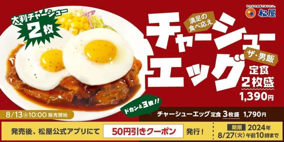 松屋で、「柔厚炙りチャーシューエッグ定食」が8月13日より販売されている。持ち帰り可能。