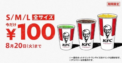 ケンタッキーフライドチキンで、「ドリンク全サイズ100円」キャンペーンが8月7日~8月20日の2週間実施されている。