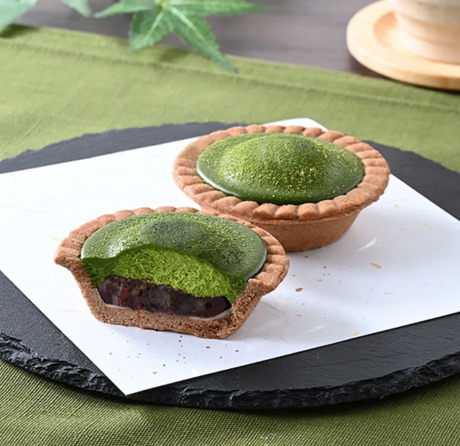 上林春松本店監修商品。香ばしいタルトに粒あんを合わせ、抹茶ホイップクリームを抹茶チョコで包んでいる。