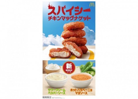 マクドナルドで、「スパイシーチキンマックナゲット」と、夜マック限定「食べくらべポテナゲ大・特大」が5月28日から7月上旬まで販売されている。「サワークリームペッパーソース」と「ホットハラペーニョマヨソース」も期間限定で登場。