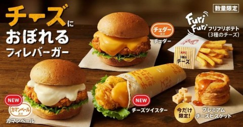 ケンタッキーフライドチキンで、「チーズにおぼれるフィレバーガー」2種と「チーズにおぼれるツイスター」、「フリフリポテト(3種のチーズ)」、「プレミアムチーズビスケット」が2月5日より販売されている。数量限定、なくなり次第販売終了。