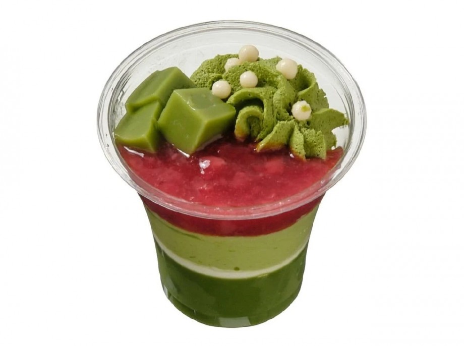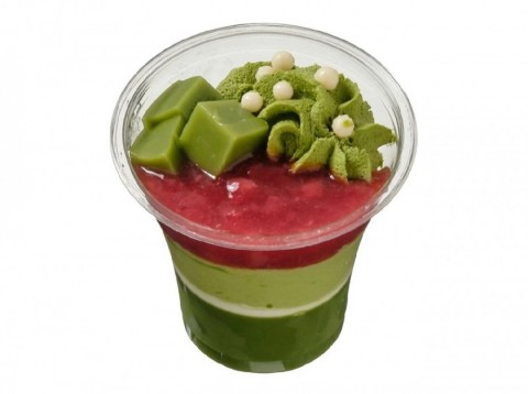 抹茶ミルクプリンとホイップ クリームの上に抹茶ムースを重ね、抹茶餡ホイップ、抹茶みるくわらび餅、甘酸っぱい苺ソースを盛り付けたパフェ。324円(税込)。