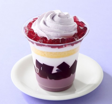 ぶどうミルクプリン、角切ぶどうゼリー、ミルクムースなどの上にぶどうのホイップクリーム、ゼリーをトッピングした、ボリューム満点の多層パフェ。348円。