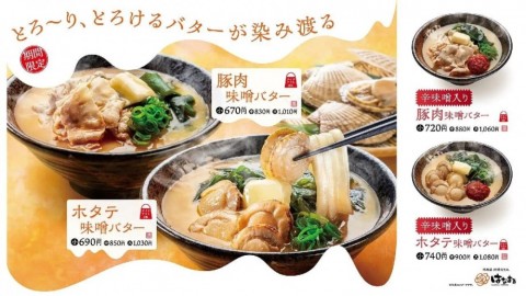 はなまるうどんで、「ホタテ味噌バター」「豚肉味噌バター」「辛味噌入りホタテ味噌バター」「辛味噌入り豚肉味噌バター」が2月6日から3月中旬まで販売されている。