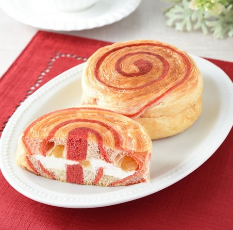 赤色の生地を合わせたデニッシュ生地をロール状に焼き上げ、レアチーズホイップとりんごをサンド。