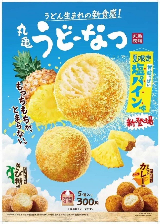 丸亀製麺で、夏限定の「丸亀うどーなつ 塩パイン味」が8月2日から9月末まで販売されている。5個入り、300円(税込)。