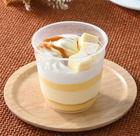 コーヒープリンにホイップを重ね、ティラミス風スフレをトッピングしたスフレ・プリン。アルコール使用。328円。