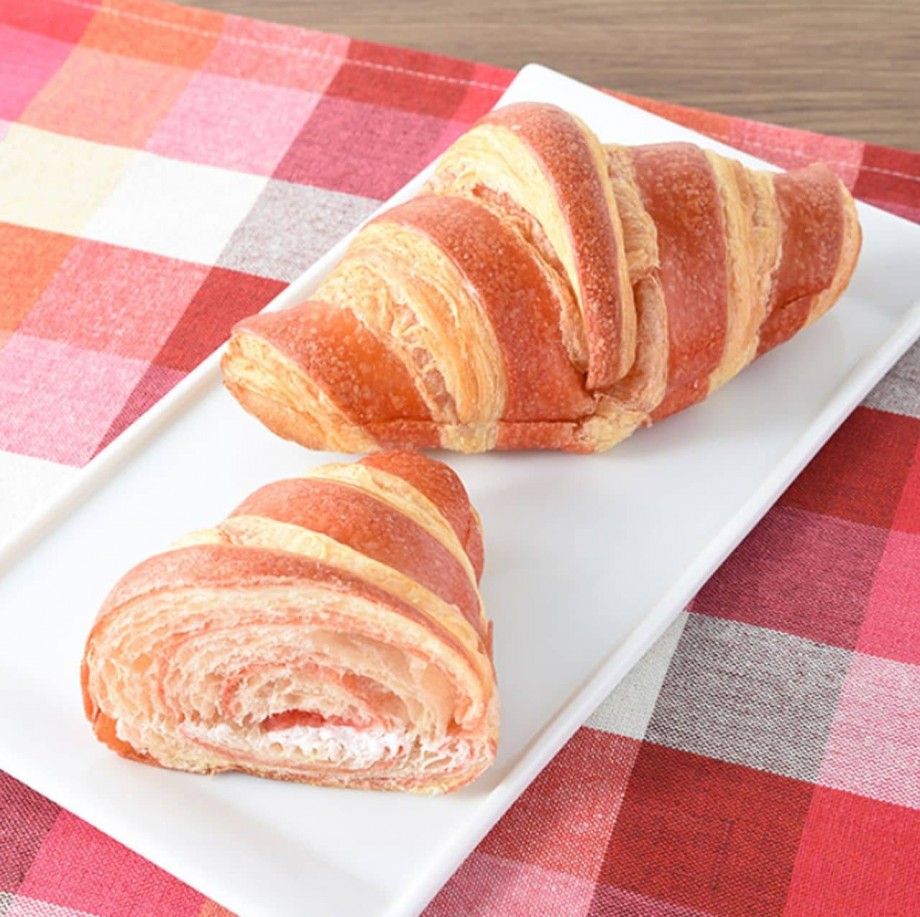 ピンク色の生地をあわせたバイカラーのクロワッサンに、甘酸っぱいあまおういちごジャムとあまおういちごのホイップをサンド。158円。