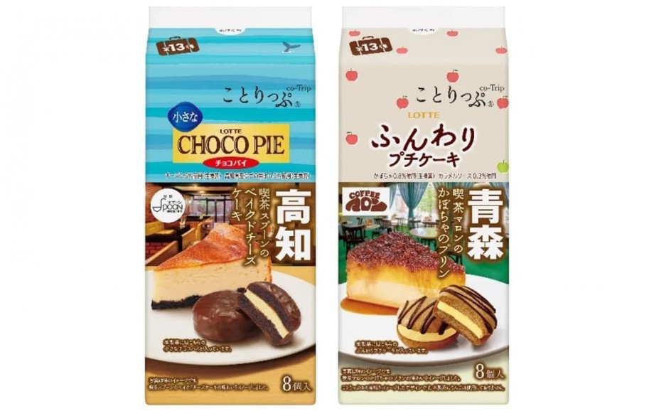 ロッテから、昭文社の人気旅行ガイドブックシリーズ『ことりっぷ』とのコラボレーション企画第13弾として「ことりっぷ 小さなチョコパイ<喫茶スプーンのベイクドチーズケーキ>」と「ことりっぷ ふんわりプチケーキ<喫茶マロンのかぼちゃのプリン>」が10月22日より販売されている。302円前後(税込)。