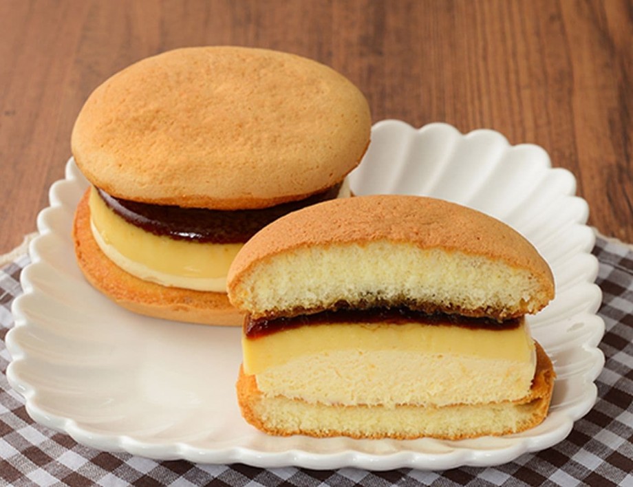 ふわふわ生地にプリンとカスタードホイップを挟んだどら焼きサンド。324円(税込)。