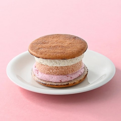 2種のクリームをバター香るサブレ生地でサンドしたスイーツ。サクサク&なめらか食感がイチゴとバニラの風味を引き立てる。358円。