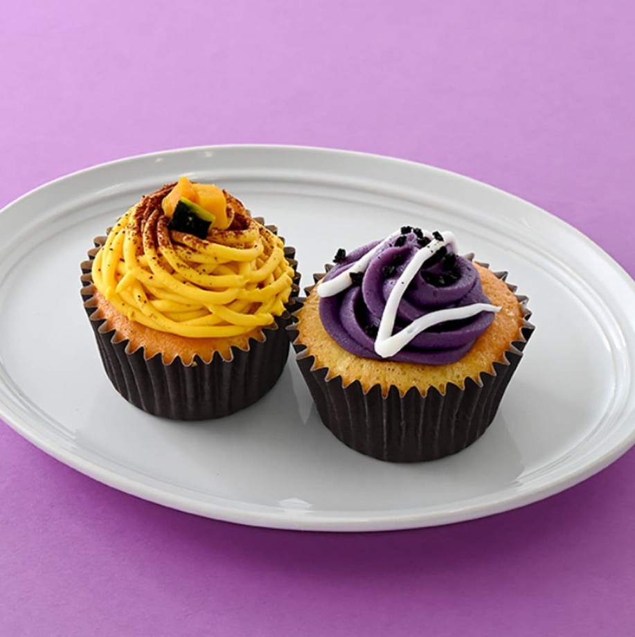 ハロウィンをイメージしたカラーリングの2個入りアソートケーキ。シフォンケーキにかぼちゃクリームと紫芋クリームをトッピング。348円。