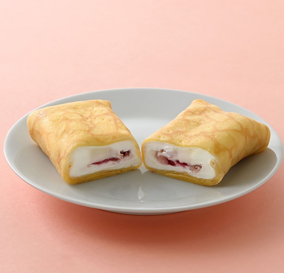 森永乳業とのコラボレーション商品。「森永加糖れん乳」を使用したクリーム&ソースに、相性の良いいちごのソース&ダイスを合わせ、もちもち食感のクレープ生地で包んだ。258円。